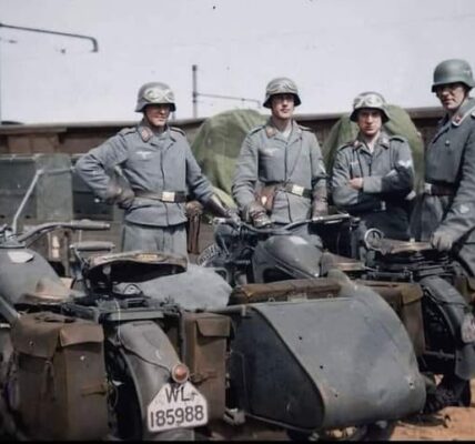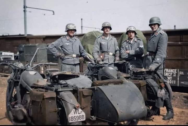 In the photo: Luftwaffe soldiers next to a BMW R12 motorcycle. In the photo: German paratroopers on reconnaissance patrol in the Italian mountains (February 1944). In the photo: A Wehrmacht soldier enjoys a bottle of wine, presumably somewhere in France….