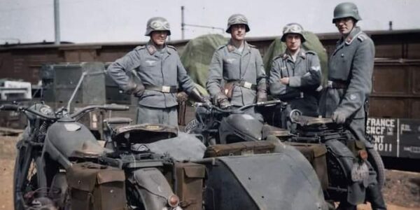 In the photo: Luftwaffe soldiers next to a BMW R12 motorcycle. In the photo: German paratroopers on reconnaissance patrol in the Italian mountains (February 1944). In the photo: A Wehrmacht soldier enjoys a bottle of wine, presumably somewhere in France….
