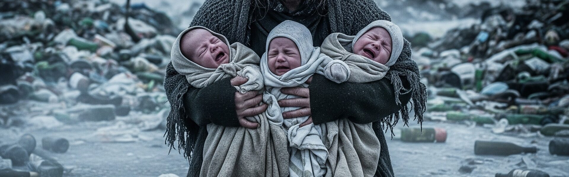 On a freezing winter night, cries echoed through the empty streets near an industrial dump. A frail woman named Hope, who survived on scraps and slept under broken roofs, followed the sound. She found them—three newborn babies, wrapped in dirty cloth, shivering on top of a pile of trash.