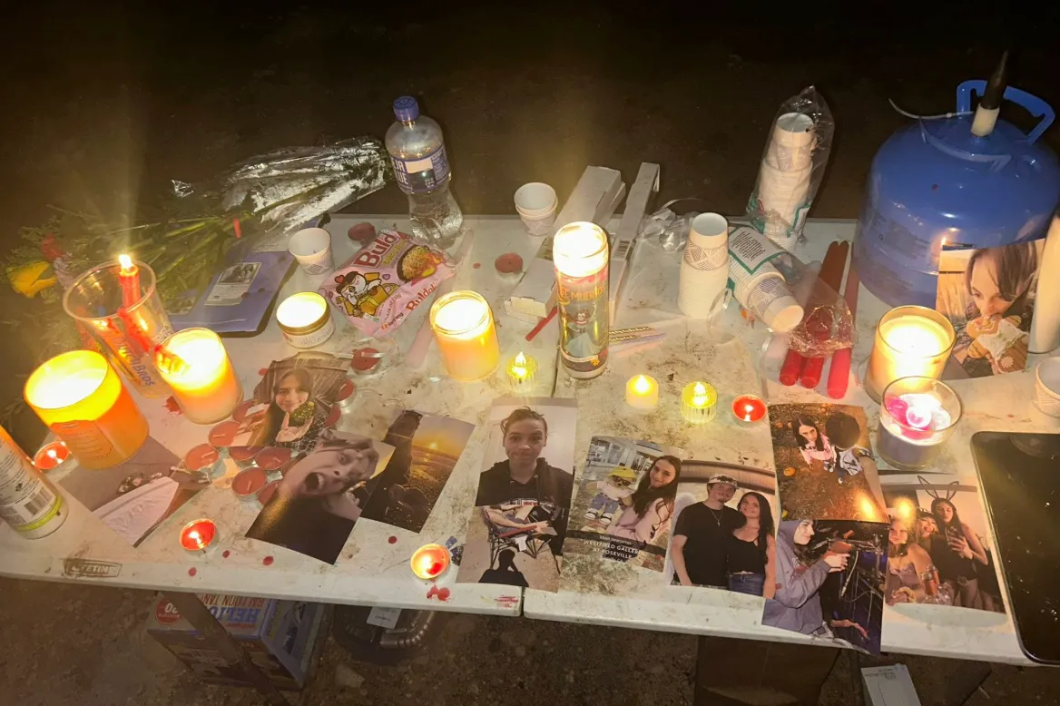 Flowers and stuffed animals piled up, trembling in the night air.