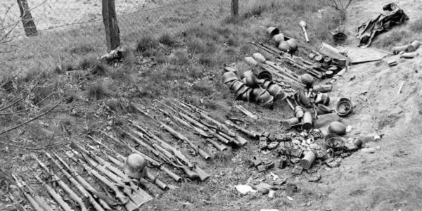 The photo shows dozens of Karabiner 98k rifles lying  neatly in rows at the edge of a wire fence, presumably at the border of a garden or field . Next to them are piles of steel helmets (M35/M40/M42) ,  canteens, mess kits, ammunition and belt pouches ,…