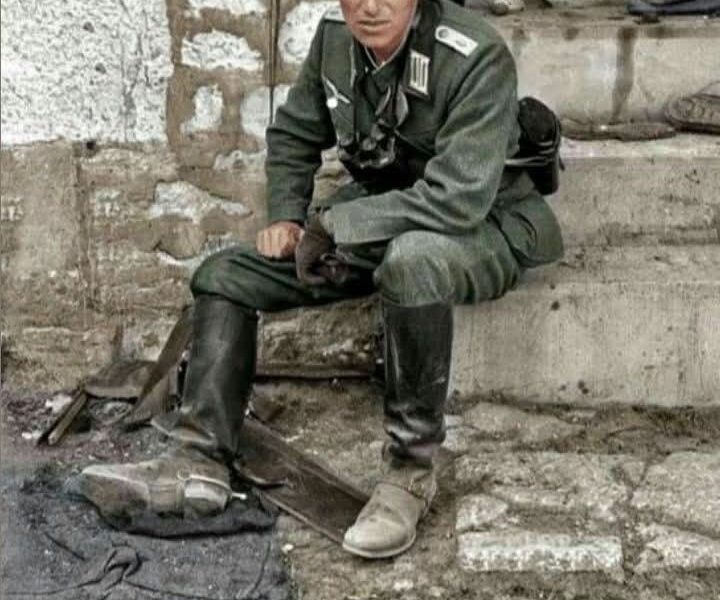 The photo shows an exhausted German officer after heavy fighting in Stalingrad (1942).