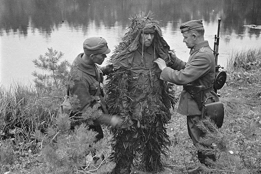 The man in the middle, who is being trained as a sniper, is already wearing a suit reinforced with plant material. This makes him virtually invisible in the environment, which is a decisive advantage, especially in densely wooded or swampy areas.