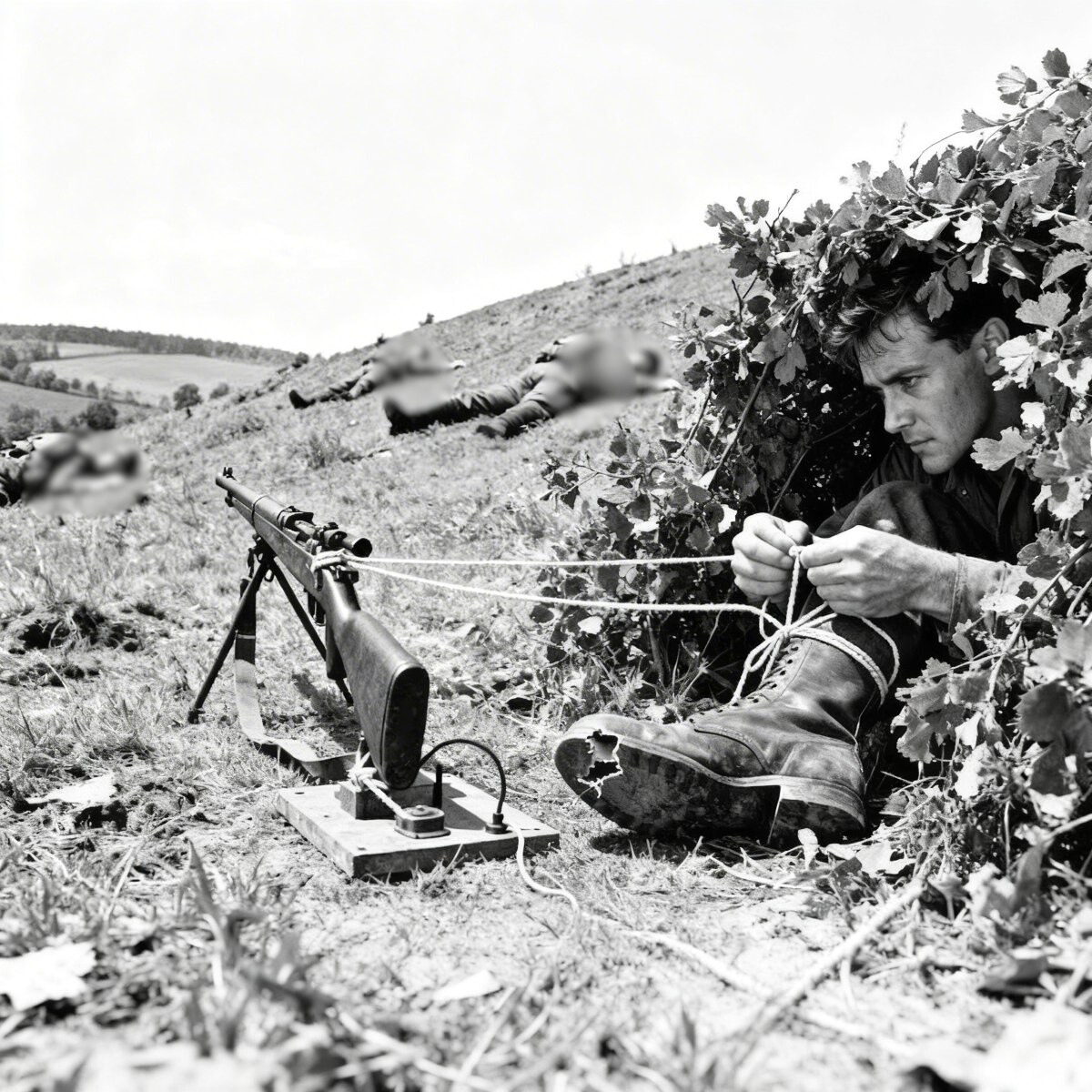 Quando la pattuglia entrò nel suo campo visivo, sparò un solo colpo preciso dalla nuova posizione e si ritirò subito. Come previsto, i tedeschi risposero sparando verso il punto sbagliato e avanzarono, tesi, per ispezionare. Durante quel movimento, qualcuno sfiorò il ramo o il punto di tensione del laccio: il fucile preparato sparò, e un altro colpo risuonò da una direzione diversa.