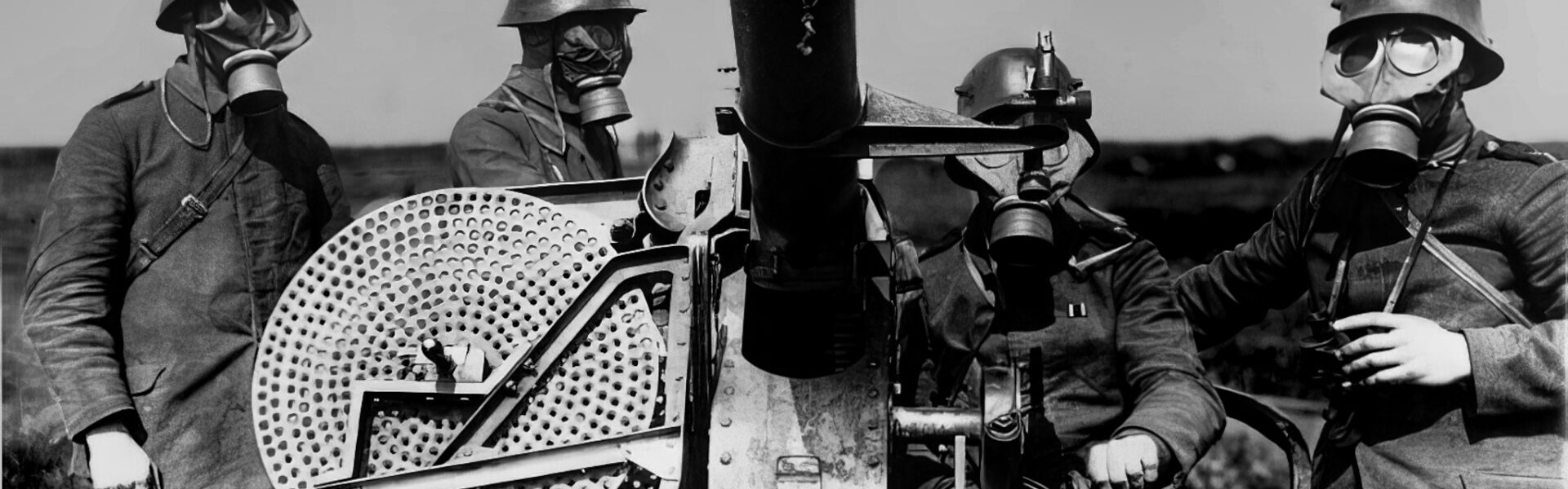 Die Soldaten auf dem Bild tragen Gasmasken, was darauf hindeutet, dass sie entweder einem Gasangriff ausgesetzt waren oder sich auf einen solchen vorbereiteten. Der Erste Weltkrieg war der erste Konflikt, in dem chemische Waffen großflächig eingesetzt wurden. Besonders die Schlachten an der Westfront