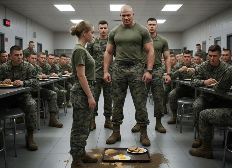 Jenna Cross, eine diskrete und beobachtende Soldatin, durchquerte den Raum wie ein Schatten. Mit ihrem Tablett – Rühreier, die herunterliefen, und verbranntem Toast – versuchte sie, keine Aufmerksamkeit zu erregen. Es war nicht die Angst, die sie unsichtbar machte, sondern der tiefe Wunsch, unauffällig zu bleiben. Sie hatte gelernt, zu analysieren, Spannungen zu erkennen, bevor sie offensichtlich wurden. Ihr Verstand arbeitete strategisch: ruhig, methodisch und immer drei Züge voraus.