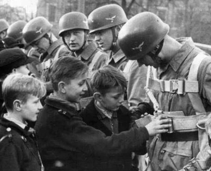 On November 21, 1941, a group of German children visited the German paratroopers in the Lustgarten on Berlin’s Museum Island. When the boys saw the sophisticated equipment, they couldn’t help but touch it.