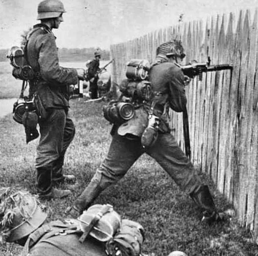 Army infantry use a depression in a wooden fence as a support for their MG42 machine gun. This makes both handling and firing the weapon more efficient. Eastern Front.