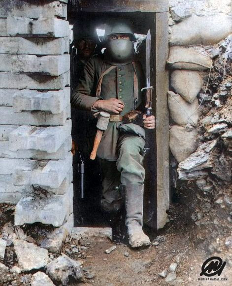 German soldiers in a trench, holding sawtooth bayonets with their forehead plates pushed down to their necks. Photograph from the First World War (1914–1918).