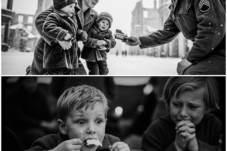 That is what the radio told her Americans did. That is what the neighbors whispered. Instead, the soldier stops chewing. He looks at the little boy whose lips are blue. He looks at the girl clutching her mother’s coat with fingers like twigs. James reaches into his field jacket pocket and pulls out a Hershey bar. Then another, then a small tin of spam, then a pack of Wrigley’s gum.