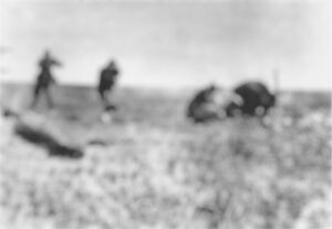 Ein seltenes Foto aus dem Zweiten Weltkrieg, aufgenommen in der Nähe von Iwanograd (Ukraine), dokumentiert eine Erschießung während der Besatzungszeit. Das Bild zeigt einen Mann, der über einem regungslos am Boden liegenden Körper steht. Am linken Bildrand sind Gewehrläufe anderer Soldaten zu erkennen.