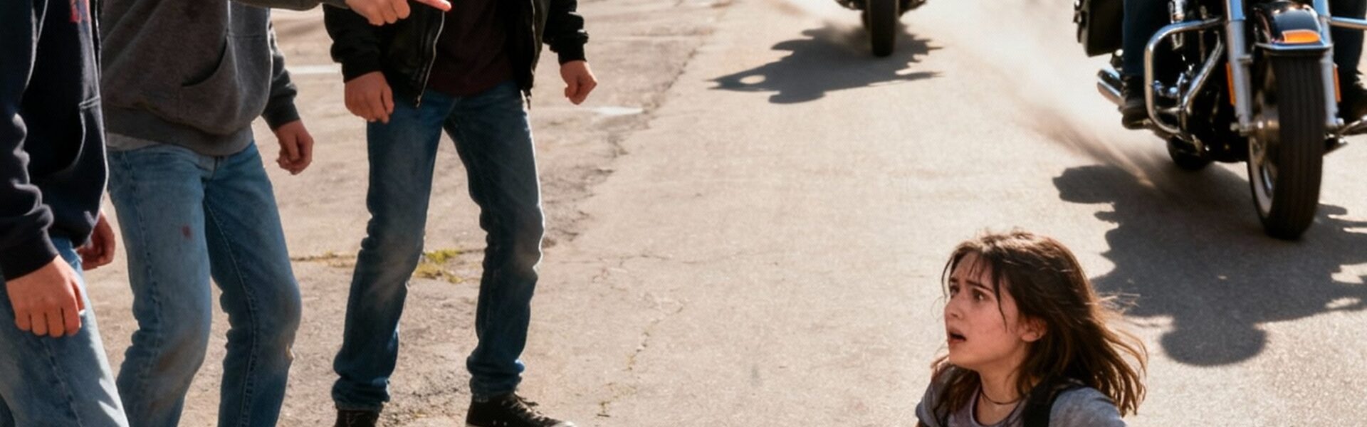 The bullies turned, confused. Around the corner came ten motorcycles, chrome gleaming under the fading afternoon sun. Their riders—broad-shouldered men and women in black leather—slowed to a crawl, watching the scene unfold.