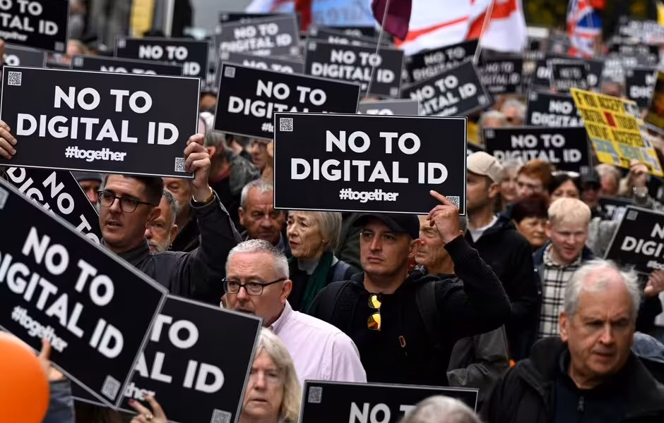 Demonstrators hold placards during a march against the implementation of digital ID cards, in central London on October 18, 2025 (Image: CHRIS J RATCLIFFE, AFP via Getty Images)