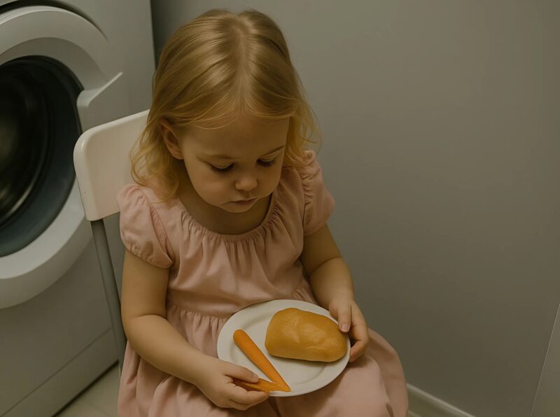 Jedes Mal, wenn ich sie zum Mittagessen rief, weigerte sie sich, an den Tisch zu gehen. Stattdessen nahm sie ihren Teller mit Essen und ging ins Badezimmer, wo sie zuvor einen kleinen Stuhl hingestellt hatte. Dort schloss sie die Tür ab und begann erst dann zu essen. Wenn sie fertig war, kam sie mit leerem Teller heraus, als wäre nichts Ungewöhnliches passiert.