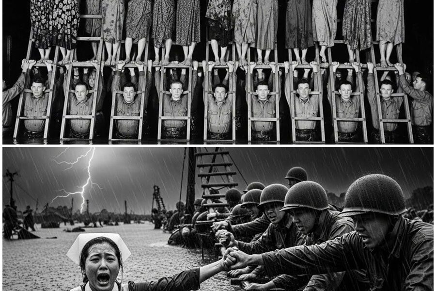27 American guards formed a human ladder in the freezing darkness and held it for 18 hours straight. Not to punish, not to humiliate, but to save the lives of 63 Japanese women who had nowhere else to go. They expected death. Instead, they got hands reaching down through the rain, pulling them up one by one, refusing to let go even as muscles screamed and the water kept rising.