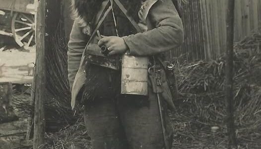 Un combattant français en 1916 quelque part sur la ligne de front. Pour lutter contre le froid et en l’absence d’équipements d’hiver réglementaires, le “poilu” doit s’adapter. Nous sommes les lendemains de l’offensive infructueuse du 14 octobre 1916 en Macédoine….