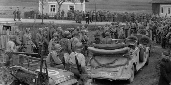 These German soldiers stand in the rubble-strewn streets of Bastogne, Belgium, on January 9, 1945, after being captured by the U.S. 4th Armored Division, which helped break the German siege of the city. By early 1945, the war that Germany…