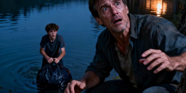 The neighbor said the cabin lights had been on every night, so I came to check. When I saw my son’s car outside, I hid in the trees and waited. Two hours later he emerged, dragging a large bag. “Please… just sink,” he whispered, shoving it into the lake. When the bag split open, I saw what was inside—my knees buckled, my breath vanished… and then I heard something move behind me. Hyn