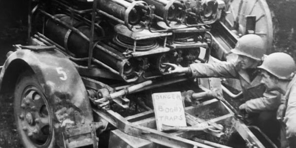 Beware, trap! US soldiers discover abandoned German Nebelwerfer emplacement with booby traps – France, 1944