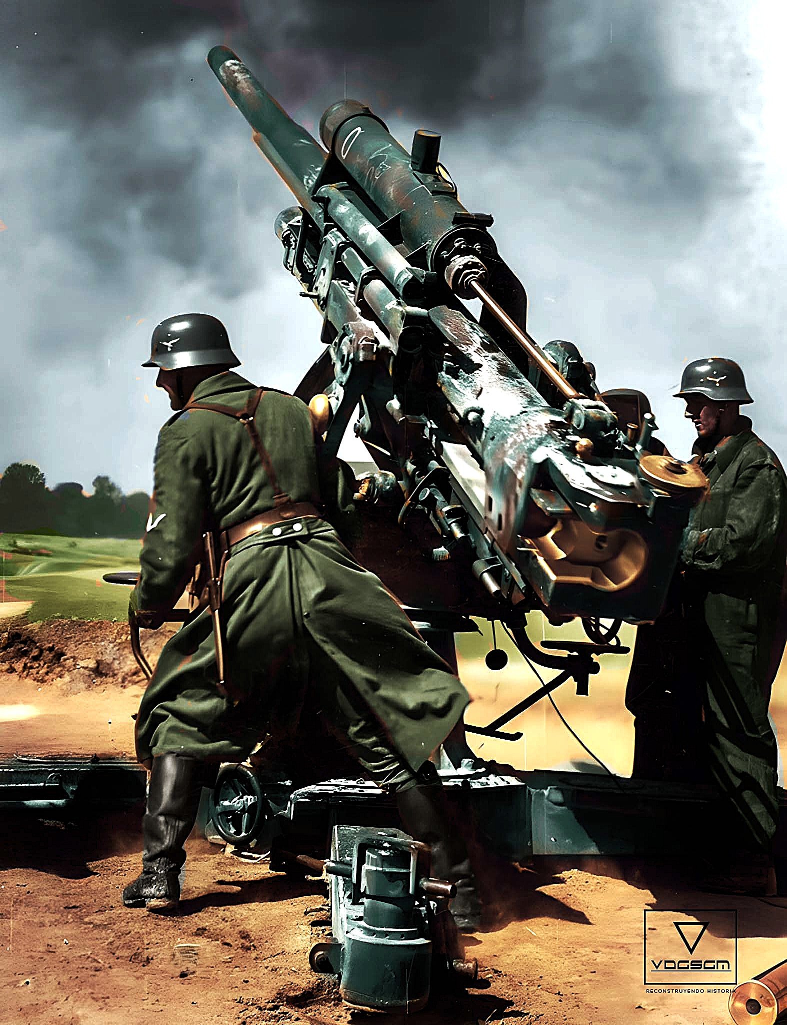 In this impressive, side-colored photo: an 8.8 mm Flak 18 in full recoil.