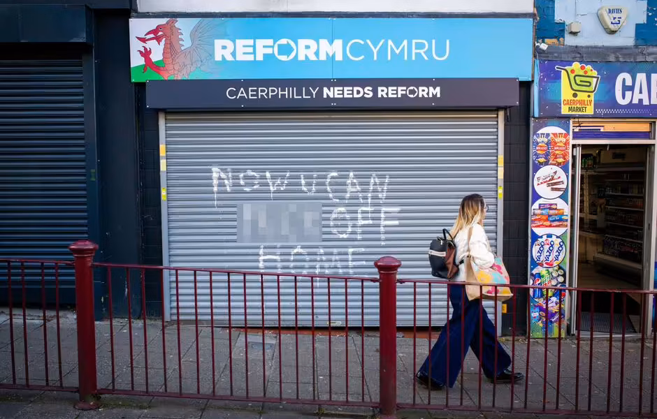 A Reform UK campaign office has been vandalised after the party lost what would’ve been a historic by-election victory. Graffiti which read “Now u can f*** off home” was spray painted onto the shutters of the Reform office on Cardiff Road, Caerphilly.