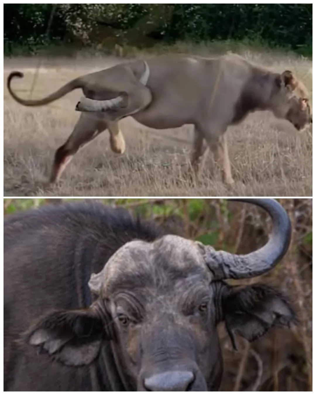 She nudged her cub backward, using her flank to block his view and guide him toward safety. The cub hesitated, confused, but the urgency in her low growl sent him stumbling into the brush. Only then did she turn her full attention to the buffalo, whose heavy hooves shook the ground beneath her.