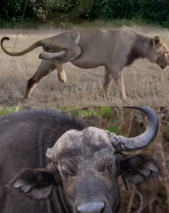 Minutes felt like hours. Dust curled around their bodies as the struggle unfolded, a desperate dance between life and death. When the buffalo finally retreated, spooked by the distant call of another predator, the lioness remained standing only through sheer will. Her breaths came ragged and shallow. But as soon as the danger passed, she turned — limping — toward the brush.