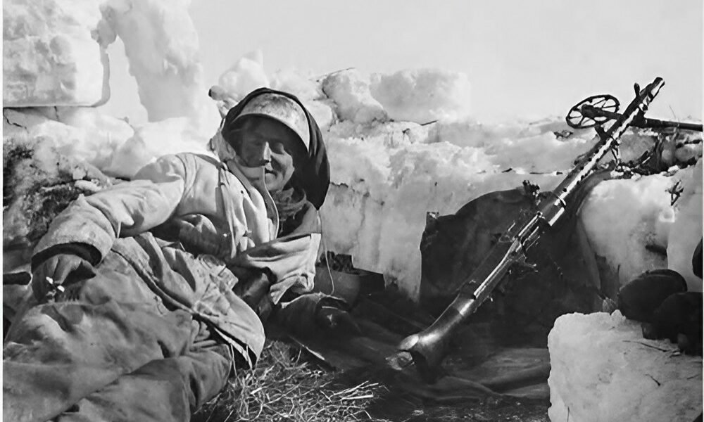 Standing in the backyard of an abandoned house in the outskirts of the besieged city of Leningrad, a rifleman of the Red Army aims and fires his machine gun at German positions on December 16, 1942.