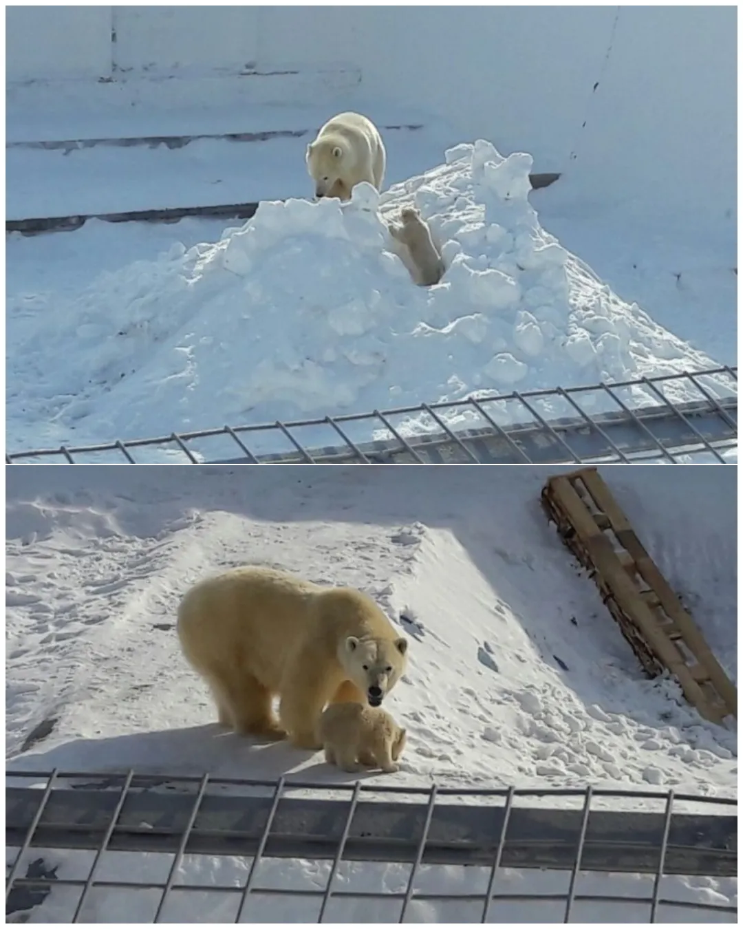 As March approached, Kolymana began teaching the cub to navigate its environment independently. She encouraged the cub to overcome thresholds on its own, nudging straw bedding into place to make climbing easier and guiding it through simple challenges. By March 24, zoo staff observed the cub moving skillfully, running after Kolymana, and imitating her actions. The young bear played joyfully in a snow trench that Kolymana had dug, demonstrating both curiosity and confidence in its developing motor skills.