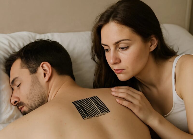 Eines Abends kam er sehr spät zurück. Ohne ein Wort zu sagen, duschte er schnell und legte sich fast sofort schlafen. Ich lag neben ihm, ohne die Augen zu schließen, und plötzlich bemerkte ich: Er drehte sich auf den Bauch. Und dort, am Nackenansatz, sah ich ein neues Tattoo. Einen Barcode. Schwarze Linien auf seiner Haut.