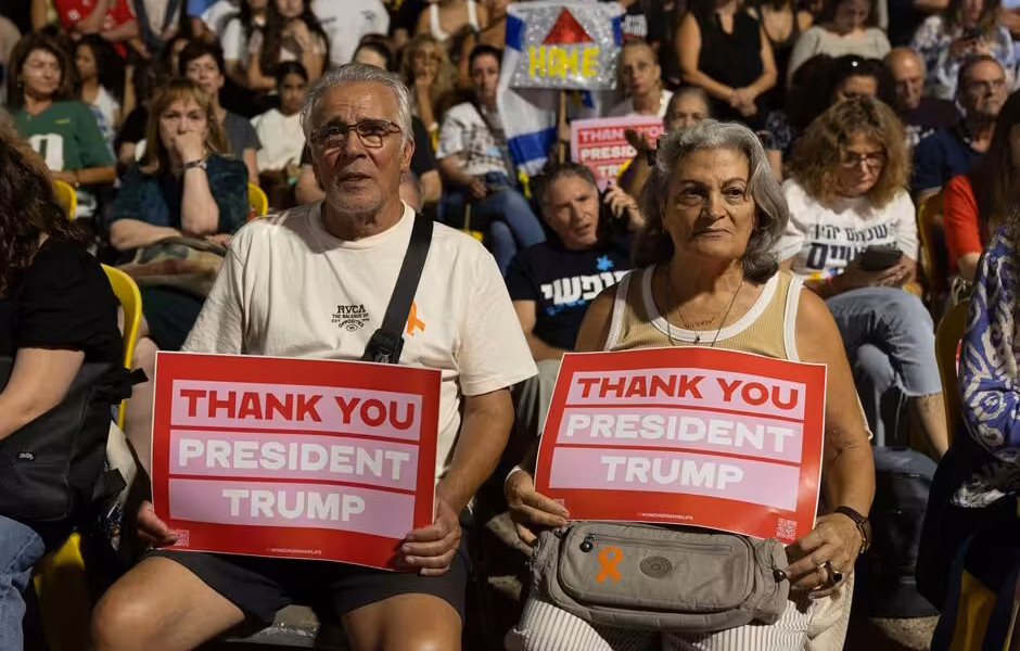 Israelis hold placards thanking President Trump for the end of the war (Image: Getty)